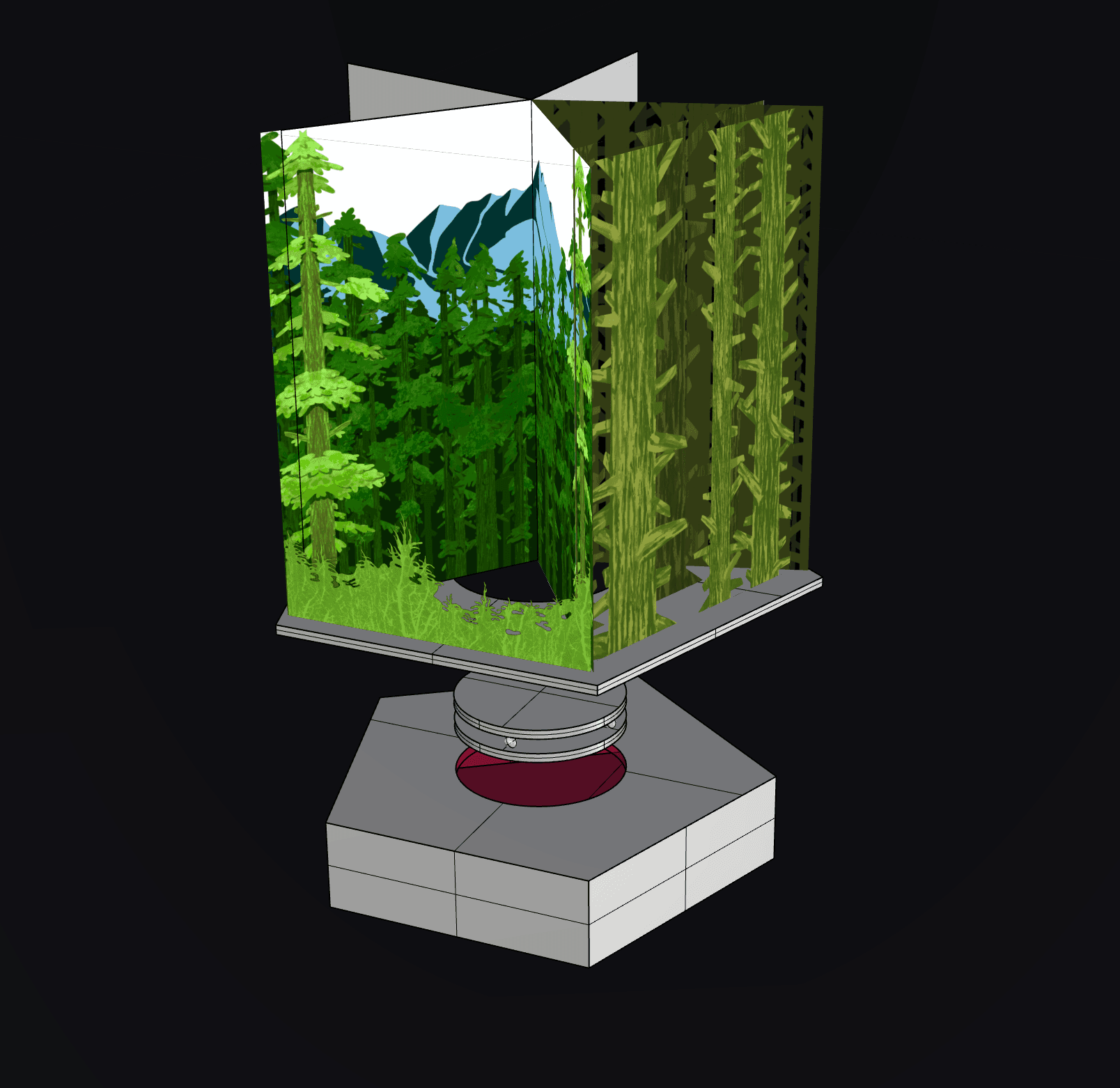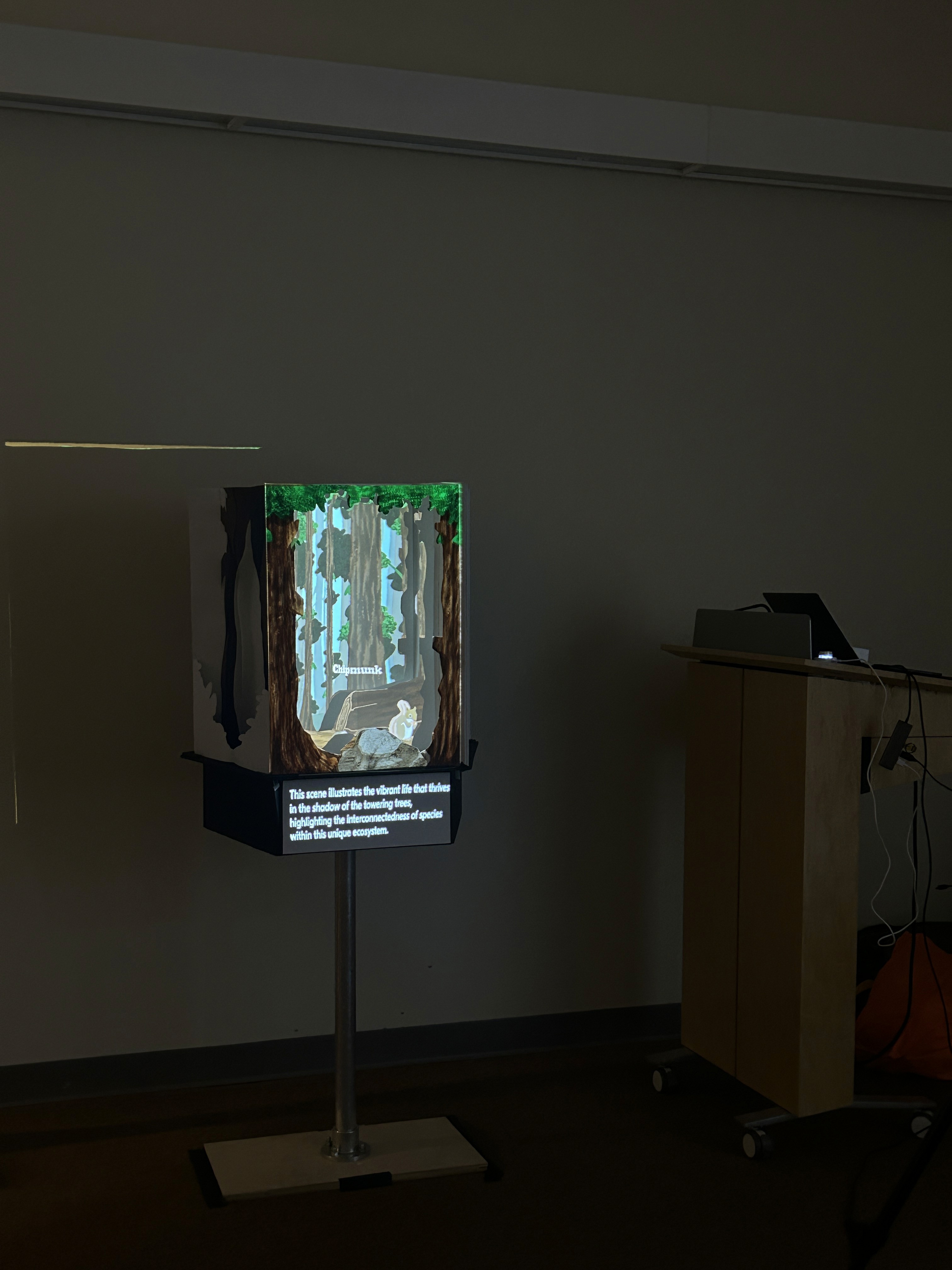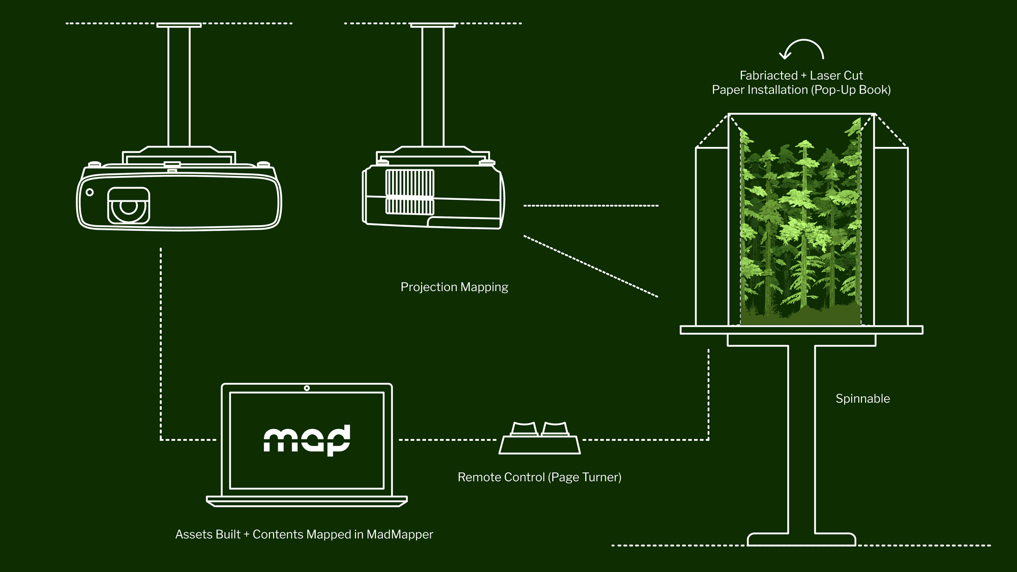 It is an immersive projection mapping installation that integrates a range of media—including a mechanical pop-up book, illustrations, animations, and sound—to introduce visitors to the Olympic Rain Forest ecosystem and its iconic species, the Douglas fir.
